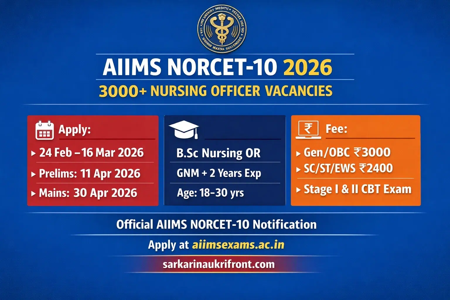 AIIMS NORCET 10 Recruitment 2026 | 3000+ Vacancies | CBT (Computer Based Test) | Salary: Up to 1,42,400 | Last Date: 16 March 2026