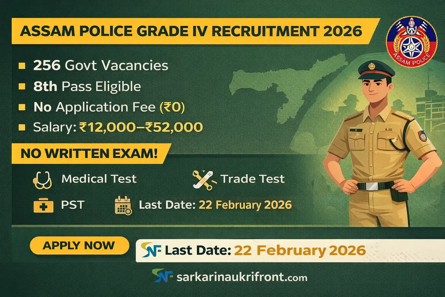 Assam Police Grade IV 2026 | 256 Posts | No Fee | 8th Pass | Last Date 22 Feb