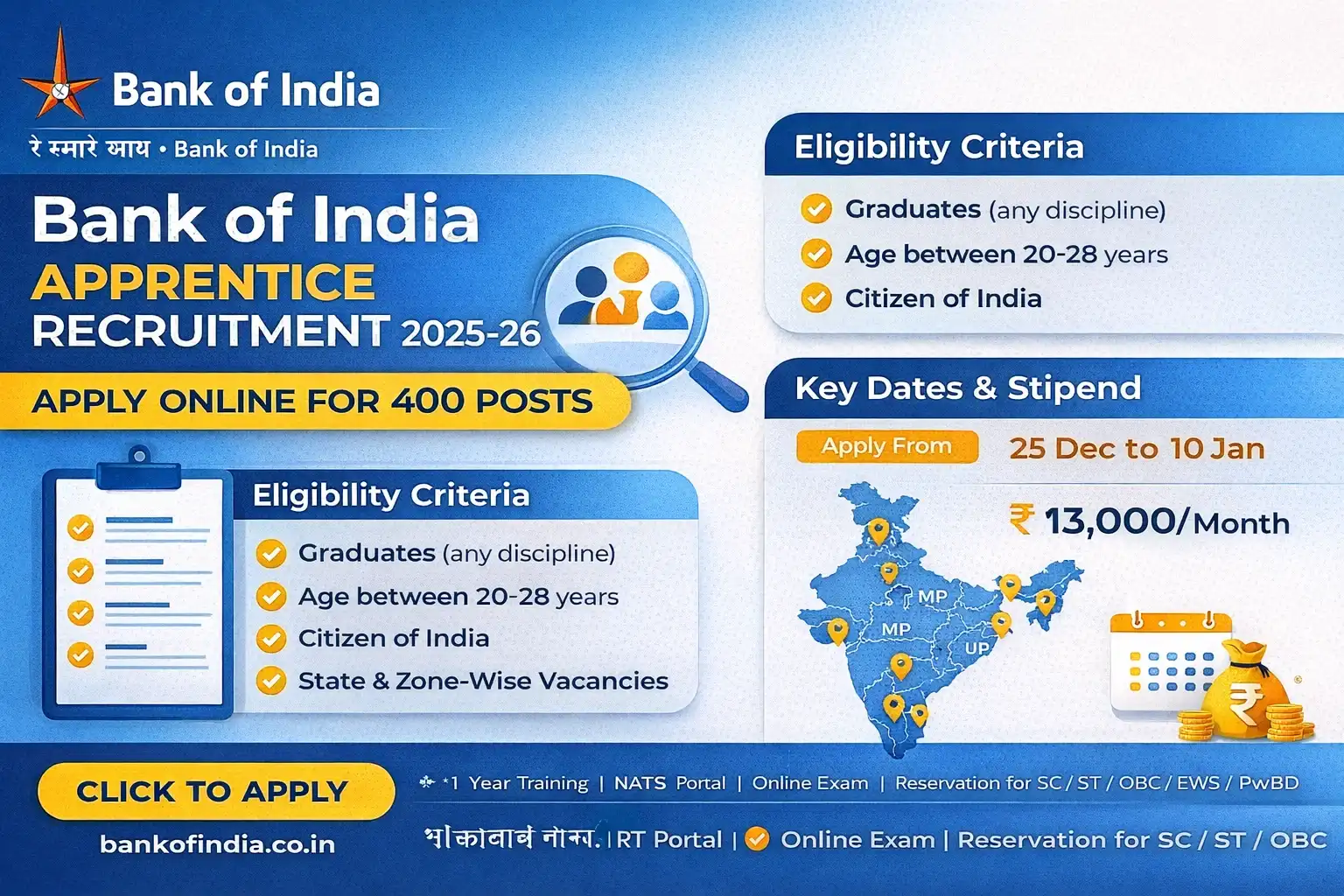 Bank of India Apprentice Hiring 2025 26: Apply Online for 400 Apprentice Posts Across India
