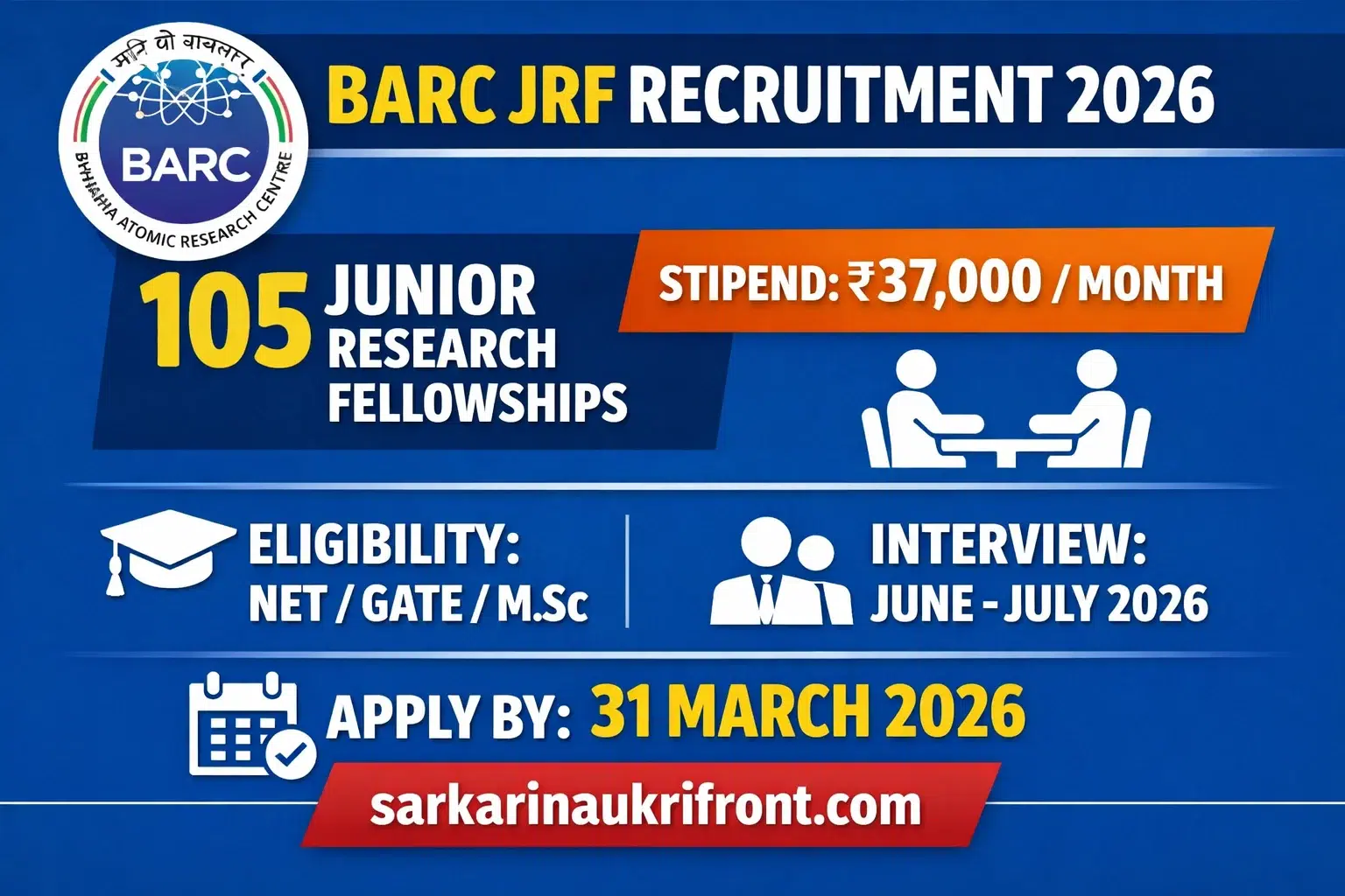 The Bhabha Atomic Research Centre (BARC) has released an official notification for BARC Junior Research Fellowship (JRF) Recruitment 2026. This recruitment drive offers 105 Junior Research Fellowships for candidates interested in research in Physical, Chemical, and Life Sciences. BARC is one of India’s premier research institutions under the Department of Atomic Energy, known for contributing to the country’s nuclear energy program and cutting-edge scientific innovations.