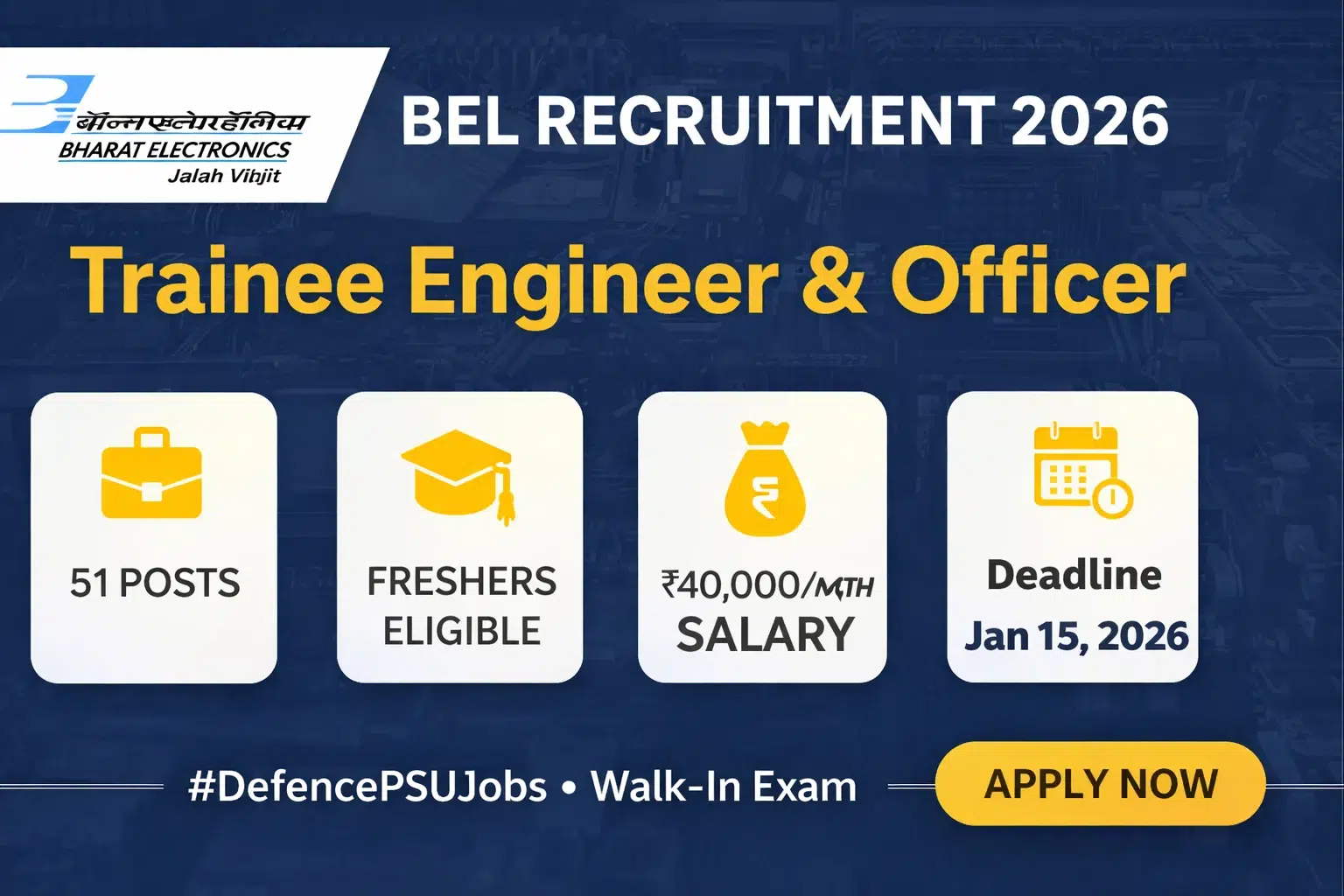 This BEL Recruitment recruitment drive is a career-defining opportunity for fresh engineering graduates and finance professionals to work with India’s premier defence electronics company. Selected candidates will receive an attractive consolidated salary of up to ₹40,000 per month, along with insurance benefits, allowances, and long-term career progression prospects within BEL.
