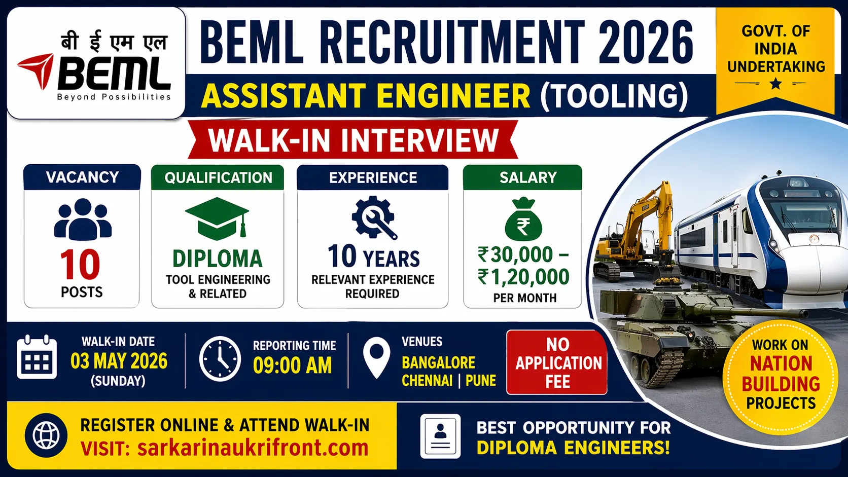 This BEML Recruitment 2026 is an excellent chance for experienced diploma engineers seeking PSU careers with high salaries and job security. BEML is a reputed defense PSU involved in prestigious national projects like Vande Bharat trains, metro coaches, mining machines, and military vehicles. Candidates with tooling experience can build a stable and rewarding career while contributing to India’s industrial growth. The attractive pay scale up to ₹1.20 lakh plus benefits makes it one of the best Diploma jobs in 2026.