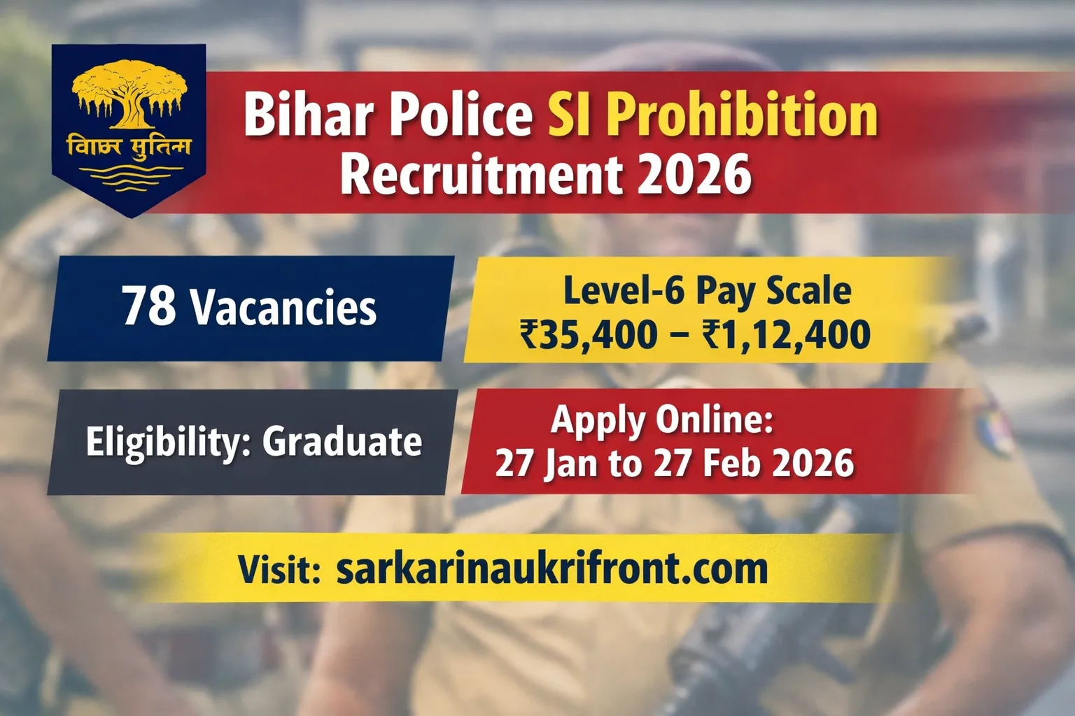The Bihar Police Sub Inspector Prohibition Recruitment 2026 notification has been officially released by the Bihar Police Subordinate Services Commission (BPSSC) for direct recruitment to the post of Sub Inspector Prohibition under the Prohibition, Excise & Registration Department, Government of Bihar. This recruitment drive is a golden opportunity for graduates seeking a respected uniformed government job in Bihar with an excellent pay scale, job security, and growth prospects.
