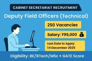 The Government of India, Cabinet Secretariat, has released Advertisement No. 02/2025, inviting applications from Indian Nationals for the post of Deputy Field Officer (Technical) based on GATE 2023/2024/2025 scores. This recruitment offers 250 vacancies across multiple disciplines, including Computer Science, Data Science, Electronics, Civil, Mechanical, Physics, Chemistry, Mathematics, Statistics, and Geology. The post carries a Level-7 Pay Matrix (Group B, Non-Gazetted) with an approximate monthly emolument of ₹99,000/- (including allowances) for postings in New Delhi.