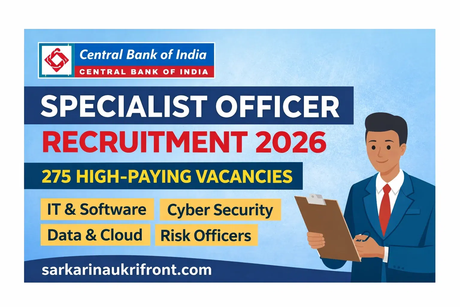 This recruitment is ideal for professionals seeking high-impact roles in a PSU bank without starting at the entry level. If you are an IT professional, cybersecurity expert, data scientist, cloud engineer, or risk professional looking for job security, authority, and policy-level exposure, Central Bank of India offers the perfect blend of technology, governance, and long-term growth. The officer cadre ensures leadership responsibilities, structured promotions, and respect associated with a nationalized bank.