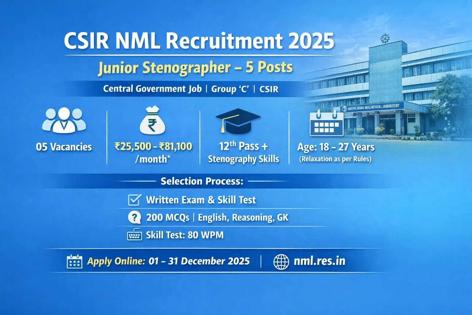 CSIR-National Metallurgical Laboratory (CSIR-NML), Jamshedpur, has officially announced the Junior Stenographer Recruitment 2025 under Advertisement No. 07/2025.