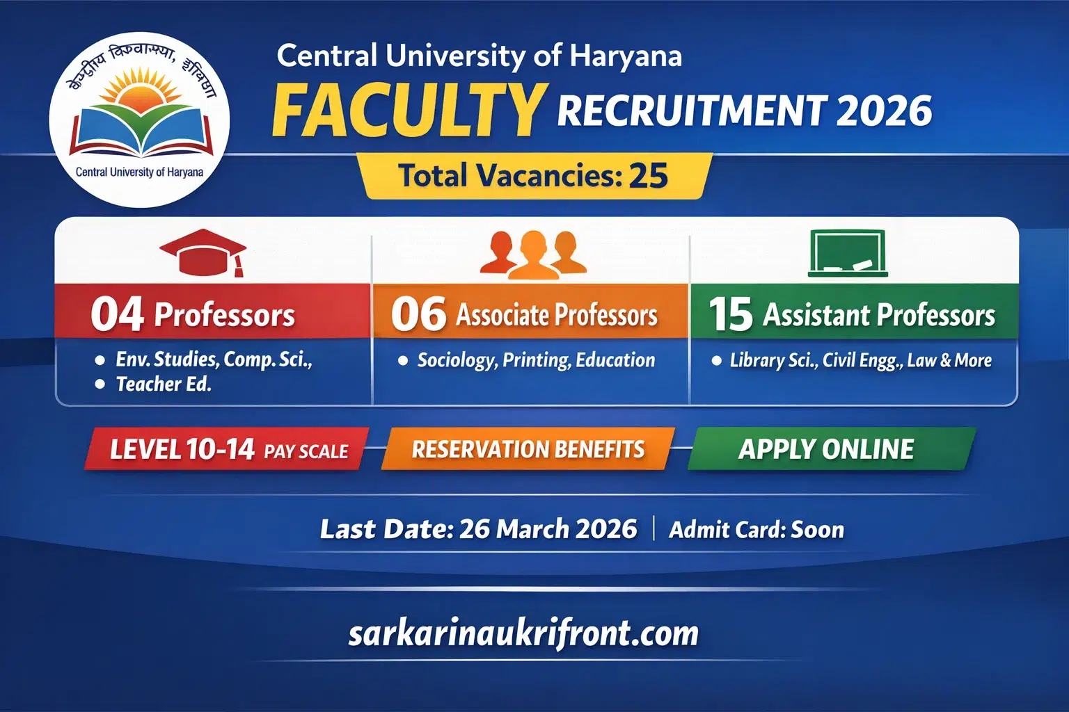 The Central University of Haryana invites online applications from Indian Nationals and Overseas Citizens of India for direct recruitment of faculty positions. The CUH recruitment 2026 is governed by UGC Regulations 2018 and applicable AICTE/NCTE norms.