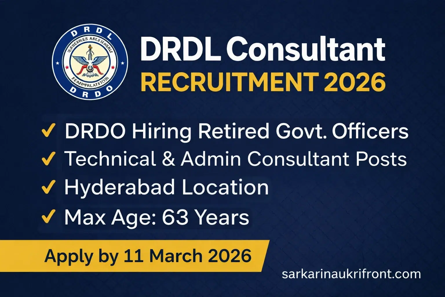 Defence Research & Development Laboratory (DRDL), Hyderabad, functioning under the Defence Research and Development Organisation (DRDO), has released an official recruitment notification for the engagement of retired government officials as consultants on a contract basis. This recruitment drive offers a rare and prestigious opportunity for experienced retired professionals from Central Government, State Government, PSUs, and Autonomous Bodies to contribute to India’s strategic defense and missile development programs. The engagement will be purely on a short-term contractual basis as per the defined Terms of Reference (TOR) for each post.