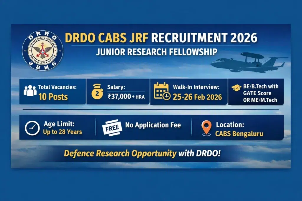 The Centre for Airborne Systems (CABS), Bengaluru, a premier laboratory of the Defence Research and Development Organisation (DRDO), has released an official notification inviting young and meritorious Indian nationals for the award of Junior Research Fellowship (JRF) through walk-in interviews.
