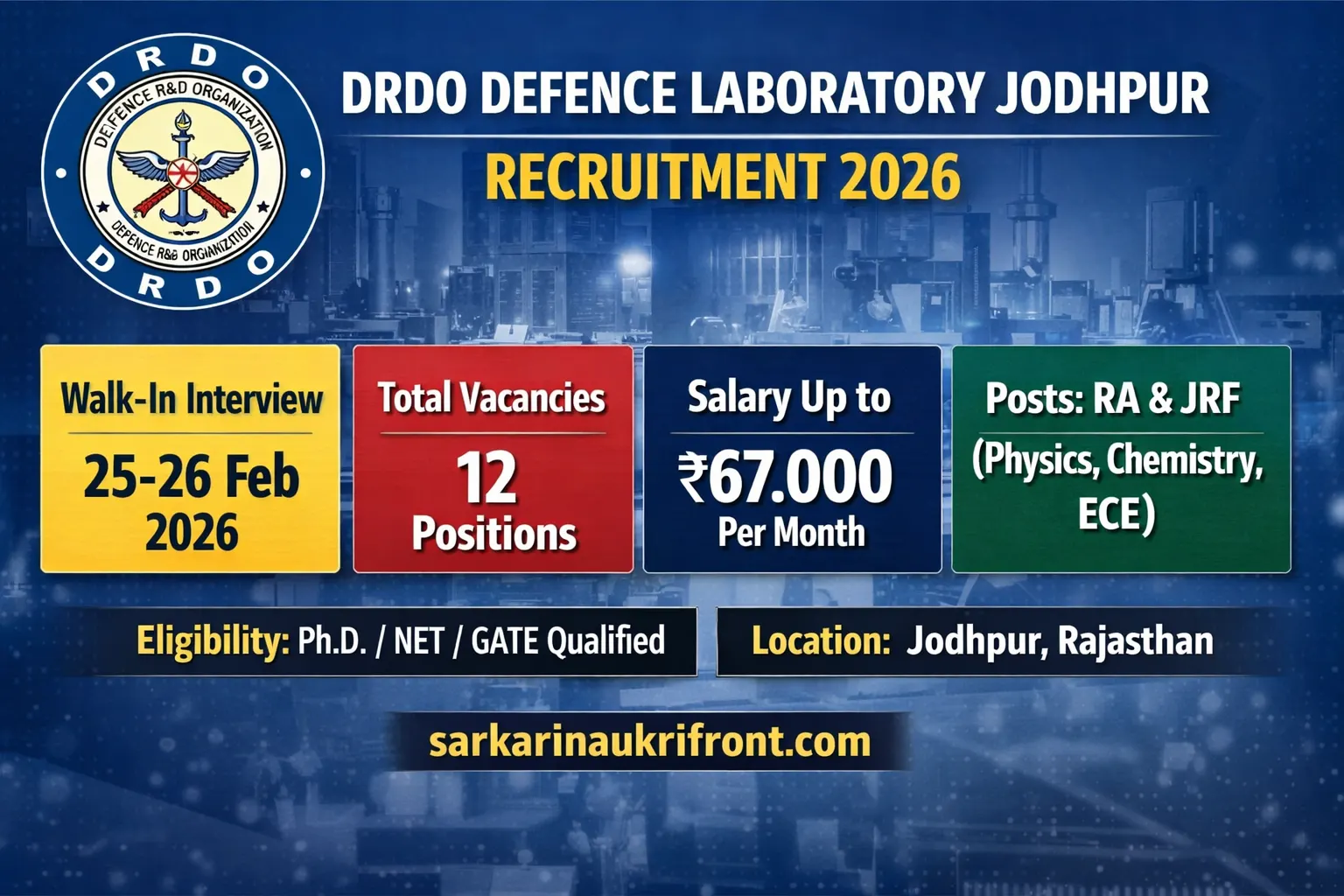 DRDO Defence Laboratory Jodhpur Job 2026: High-Value Walk-In for RA & JRF Posts