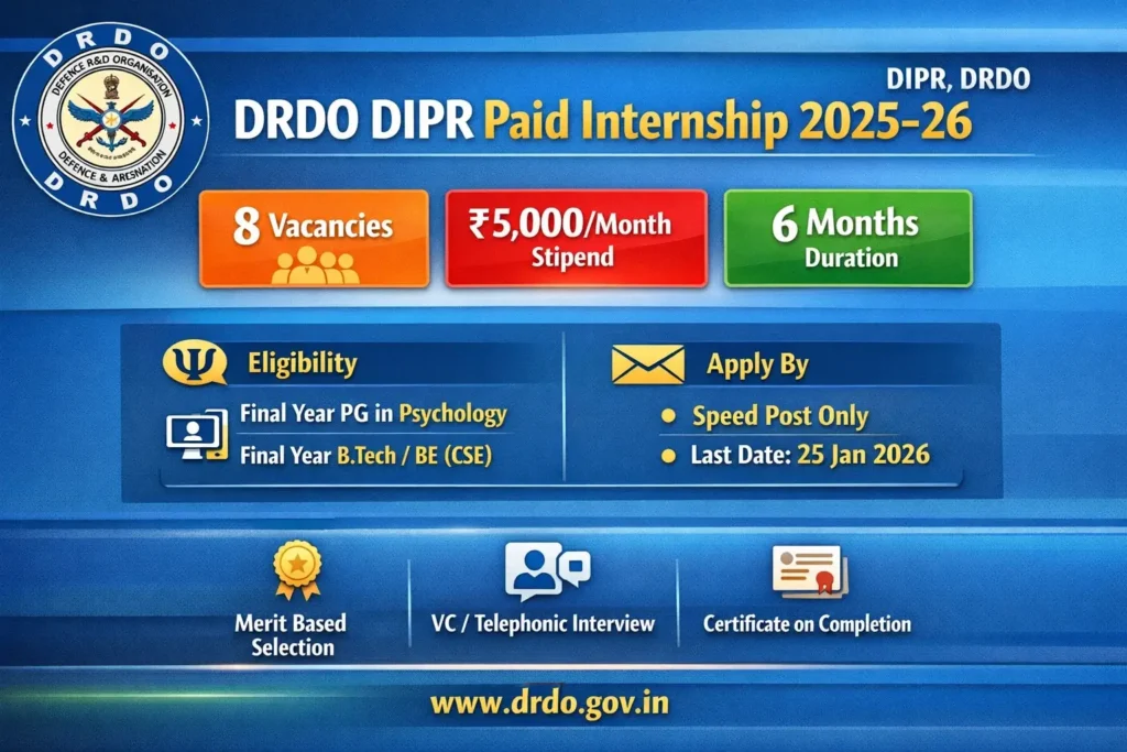 The Defence Institute of Psychological Research (DIPR), a premier laboratory under DRDO, has invited applications for Paid Internship 2025–26 for meritorious final-year PG Psychology students and final-year B.Tech/BE (CSE) students. Selected interns will undergo 6 months of internship training at DIPR, Delhi, and receive a monthly stipend of ₹5,000. This internship provides hands-on exposure to defense-related psychological and computational research, making it a prestigious opportunity for aspiring researchers and engineers.