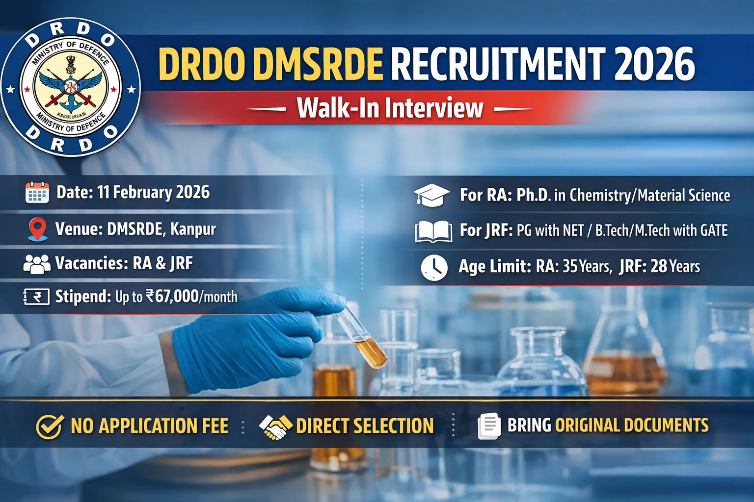 DRDO DMSRDE Recruitment 2026 | Walk-in Interview | RA & JRF Posts | Stipend ₹67,000 | PhD/NET/GATE | Interview: 11/02/2026