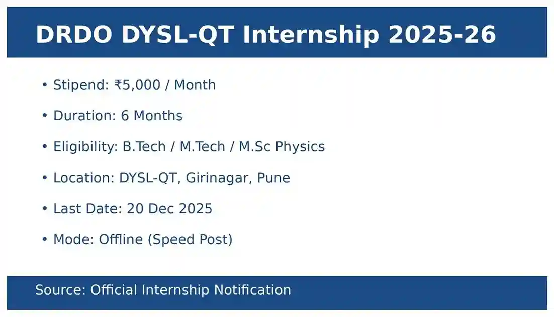Eligible students from 7th/8th semester of B.Tech, 3rd/4th semester of M.Tech, or 2nd year of M.Sc Physics can apply through offline mode within the official deadline. The internship will be conducted at DYSL-QT, DIAT Campus, Girinagar, Pune, and selected candidates will receive a monthly stipend of ₹5,000/- for the internship tenure.