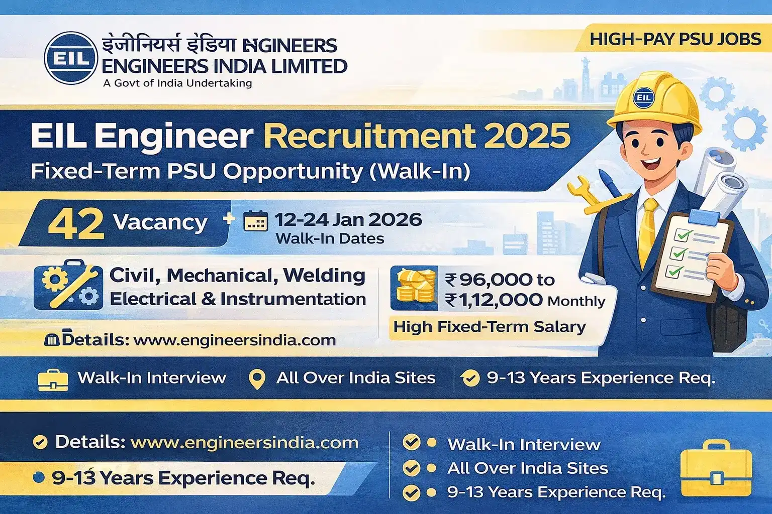 Engineers India Limited (EIL), a prestigious Navratna PSU under the Government of India, has released Advertisement No. HRD/Rectt./2025-26/13 for the engagement of experienced Engineers on Fixed Term Basis through Walk-in interviews.