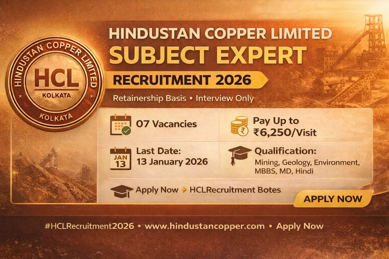 Hindustan Copper Limited (HCL), a Schedule-A, Miniratna Category-I Central Public Sector Enterprise under the Government of India, has released an official notification dated 03 January 2026 for the engagement of Subject Experts on a Retainership Basis.