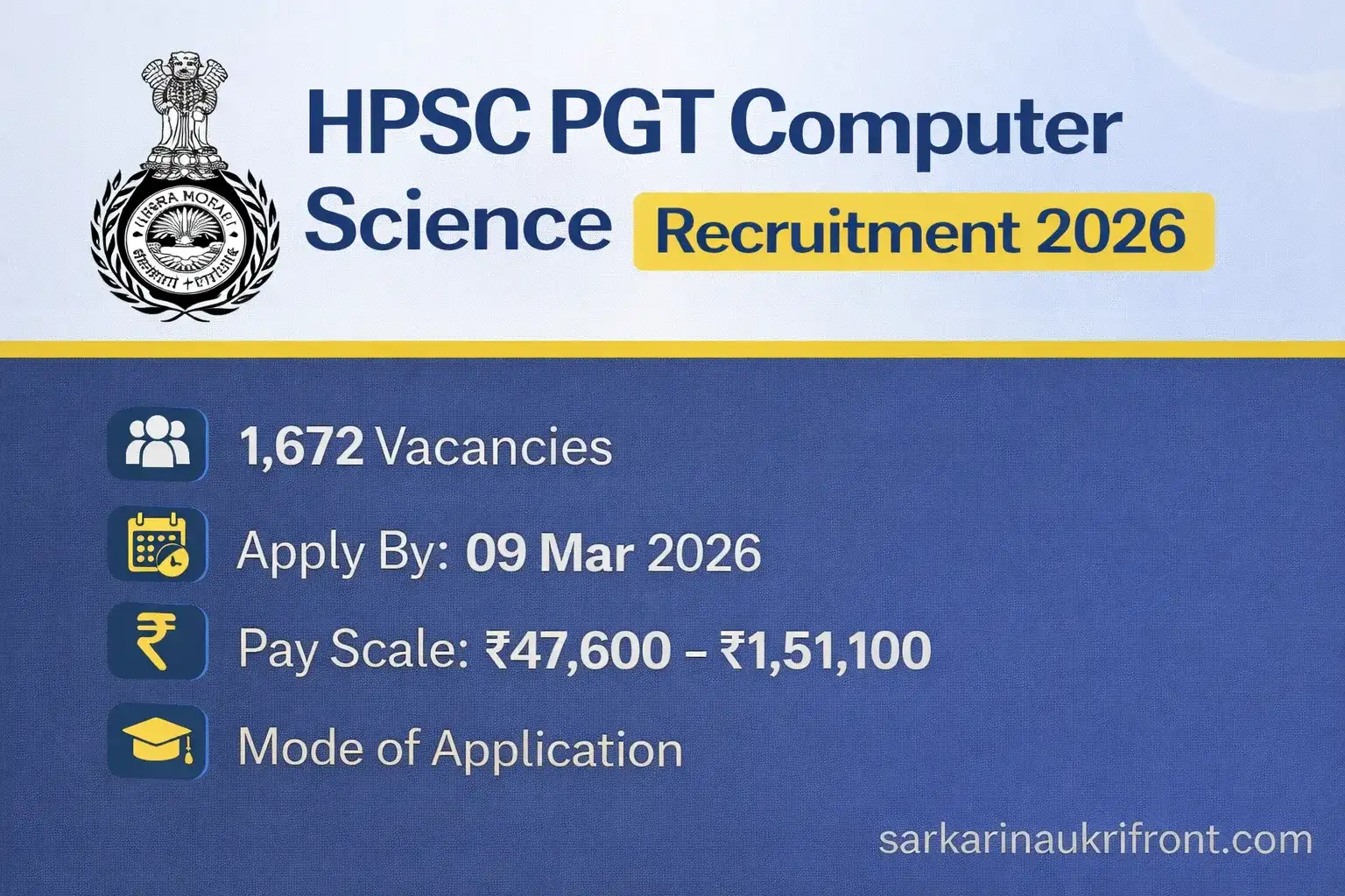 The Haryana Public Service Commission (HPSC) has officially released the PGT Computer Science Recruitment 2026 Notification, inviting online applications for a large number of Post Graduate Teacher (PGT) Computer Science posts. This recruitment drive aims to fill 1,672 vacancies under the Rest of Haryana Cadre and Mewat Cadre, making it one of the largest teacher recruitment drives in Haryana in 2026.