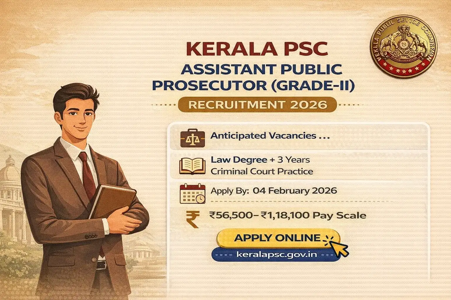 Kerala PSC Asst Public Prosecutor Job 2026 | Assistant Public Prosecutor Grade-II Post | No Application Fee | Pay Scale ₹56500-118100 | Last Date: 4/2/2026