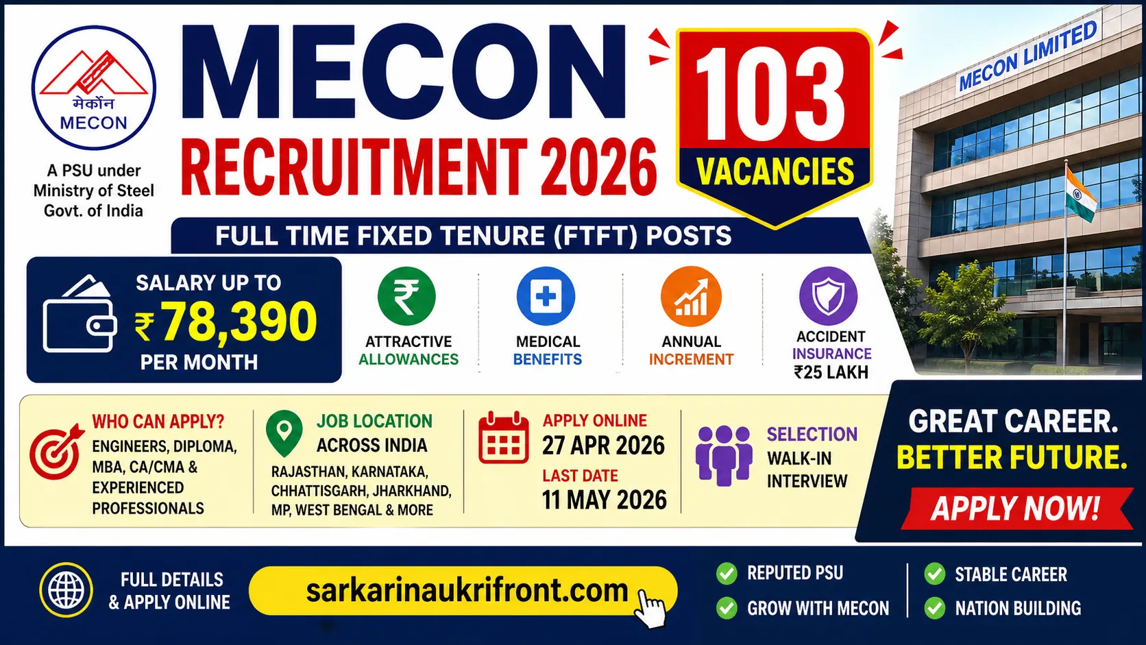 Looking for a high-paying PSU opportunity in 2026? MECON Limited has released a major recruitment notification for 103 Full-Time Fixed-Tenure (FTFT) contractual posts across engineering, HR, finance, admin, safety, mining, planning, quality, and other departments. Candidates can get a monthly salary of up to ₹78,390 along with a site allowance, metro allowance, HRA, medical benefits, and annual increment. Eligible candidates can apply online from 27 April 2026 to 11 May 2026.