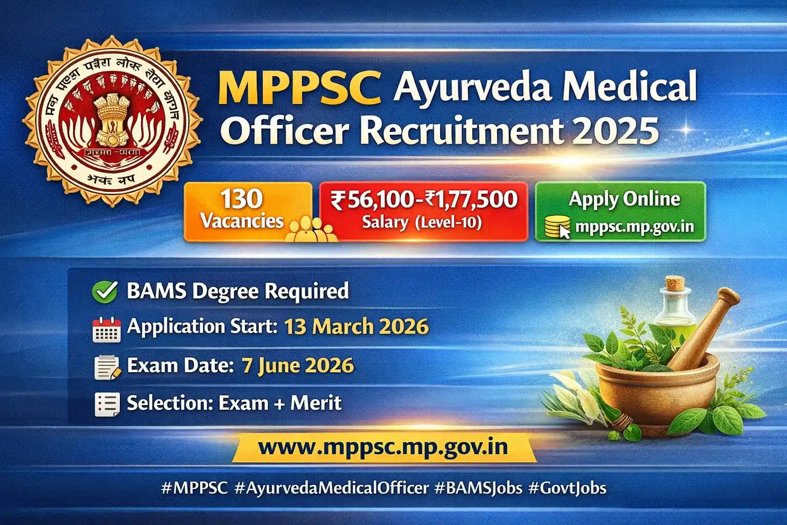 Madhya Pradesh Public Service Commission (MPPSC) has officially released the Ayurveda Medical Officer Examination 2025 notification for recruitment to 130 Ayurveda Medical Officer posts under the Directorate of AYUSH, Government of Madhya Pradesh. This recruitment drive is a prestigious government job opportunity for BAMS-qualified candidates, offering a Level-10 pay scale (₹56,100 – ₹1,77,500) along with allowances.