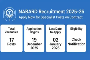 The National Bank for Agriculture and Rural Development (NABARD), India’s apex development financial institution, has released Advertisement No. 06 for the recruitment of Specialists on Contract for the year 2025–26. A total of 17 vacancies are available across multiple departments, including the Risk Management Department (RMD), RMSMED, DOR, DDMABI, DIT, and DEAR. The positions are based at NABARD’s Head Office in Mumbai.