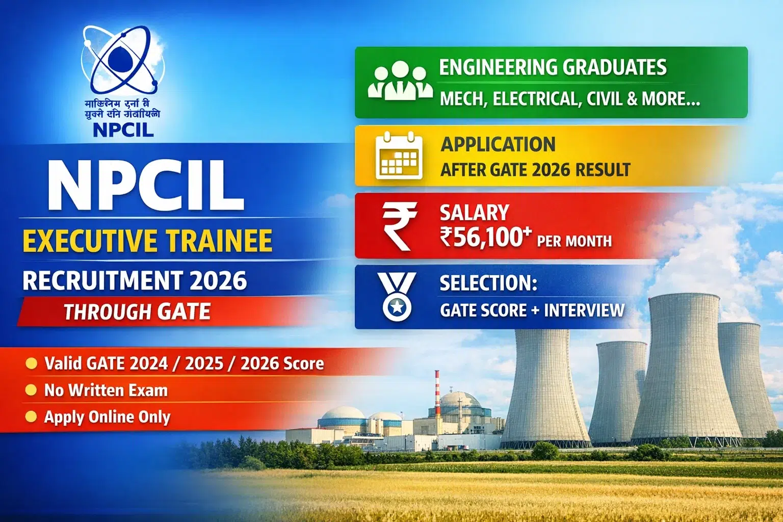 Nuclear Power Corporation of India Limited (NPCIL), a premier Public Sector Enterprise under the Department of Atomic Energy, Government of India, has announced the recruitment of Engineering Graduates as Executive Trainees (ET-2026) through GATE 2024/2025/2026 scores.