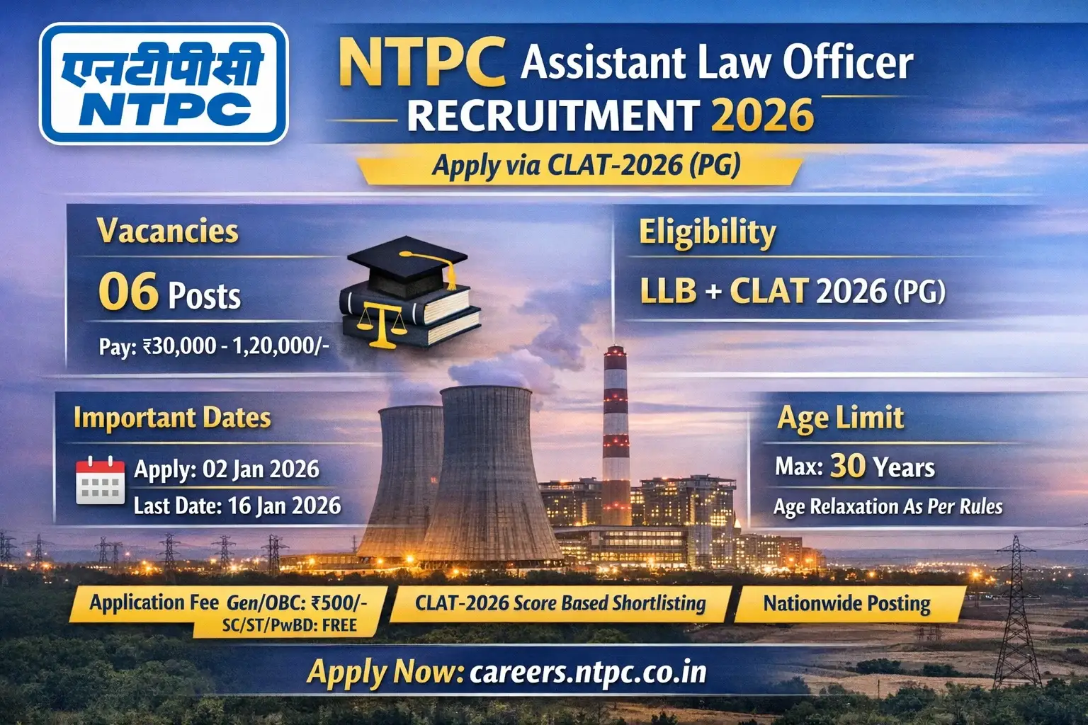NTPC Assistant Law Officer Job 2026 | LLB + CLAT-2026 PG appeared | multi-stage selection | Salary up to ₹120000 | Last Date: 16/1/2026