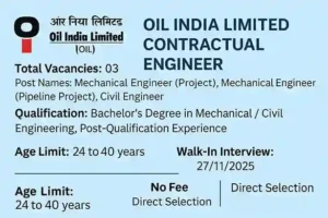 Oil India Limited invites eligible Indian nationals to participate in the Walk-in-Interview for three contractual engineering positions. Candidates must hold a Bachelor’s Degree in Mechanical or Civil Engineering (4-year duration) and possess more than 3 years of post-qualification experience in a reputable organization.