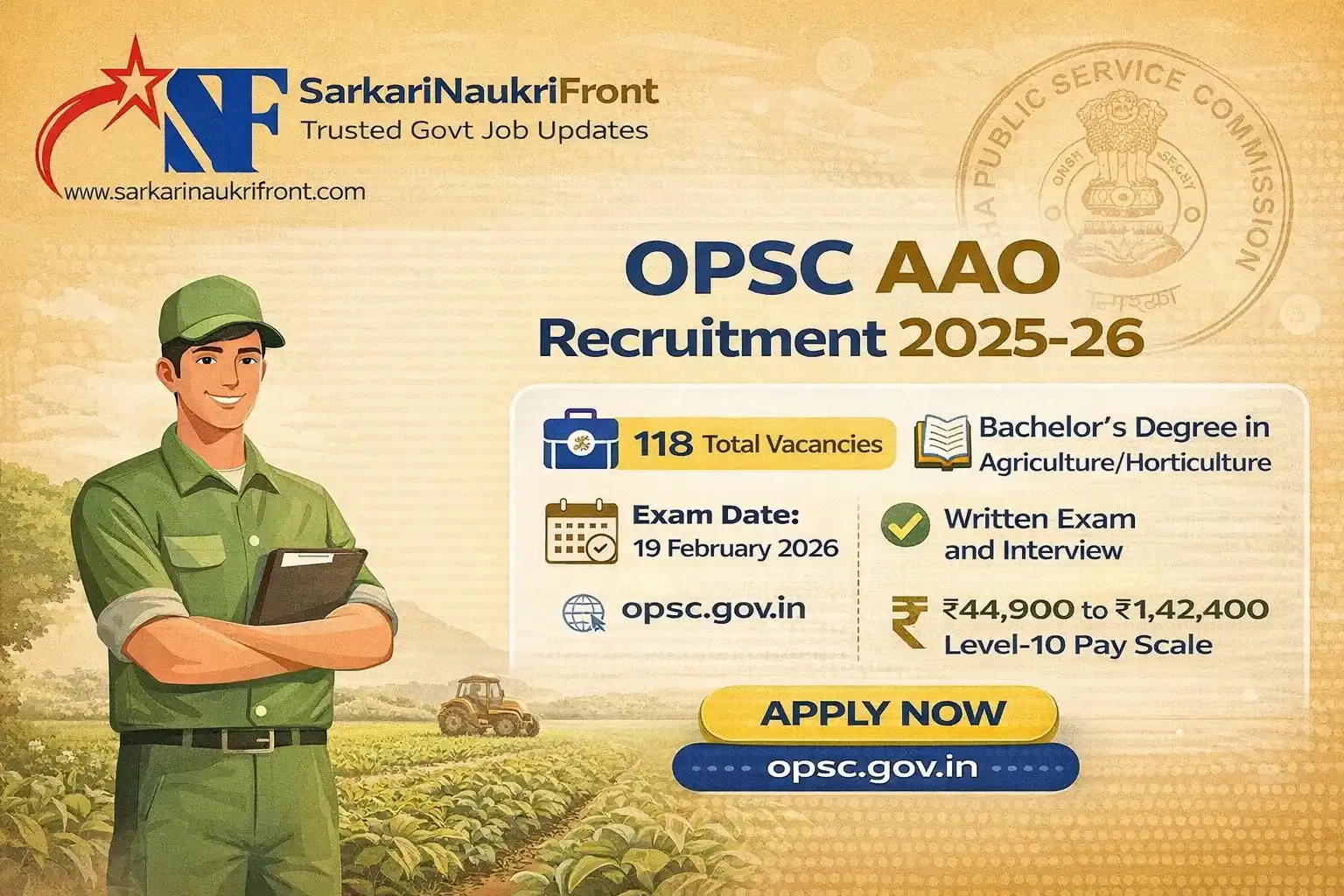 The Odisha Public Service Commission (OPSC) has released a major recruitment notification inviting online applications for 118 Assistant Agriculture Officer (AAO) posts under the Odisha Agriculture & Food Production Service, Group B.