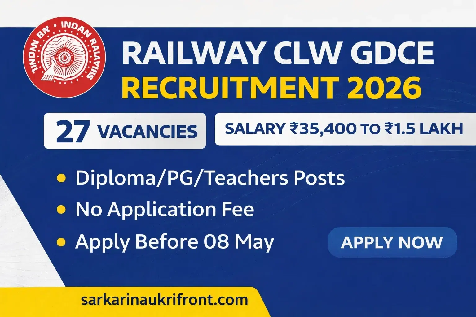 Indian Railways – Chittaranjan Locomotive Works (CLW) has released the GDCE Recruitment 2026 Notification for various posts, including Junior Engineer, Depot Material Superintendent (DMS), and School Teacher (PGT). This recruitment is conducted under the General Departmental Competitive Examination (GDCE) for eligible railway employees.