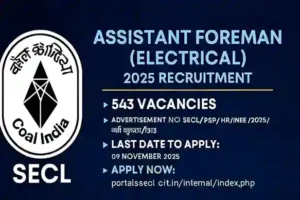South Eastern Coalfields Limited (SECL), a subsidiary of Coal India Limited, has released a departmental recruitment notification for 543 posts of Assistant Foreman (Electrical), Grade C. This is a golden opportunity for eligible internal candidates seeking a stable career in the public sector. As part of the Sarkari Job Vacancy 2025 drive, this selection is exclusively for SECL employees under the manpower budget 2025–26.