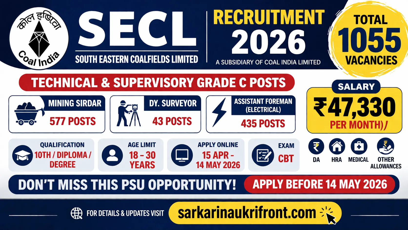 South Eastern Coalfields Limited (SECL), a subsidiary of Coal India Limited, has released a major employment notification for Technical & Supervisory Grade C posts. This recruitment drive offers a stable PSU career with an attractive salary, job security, and growth opportunities. As per the official notification (dated 08 April 2026), candidates can apply online for posts such as Mining Sirdar and Dy. Surveyor and Assistant Foreman.