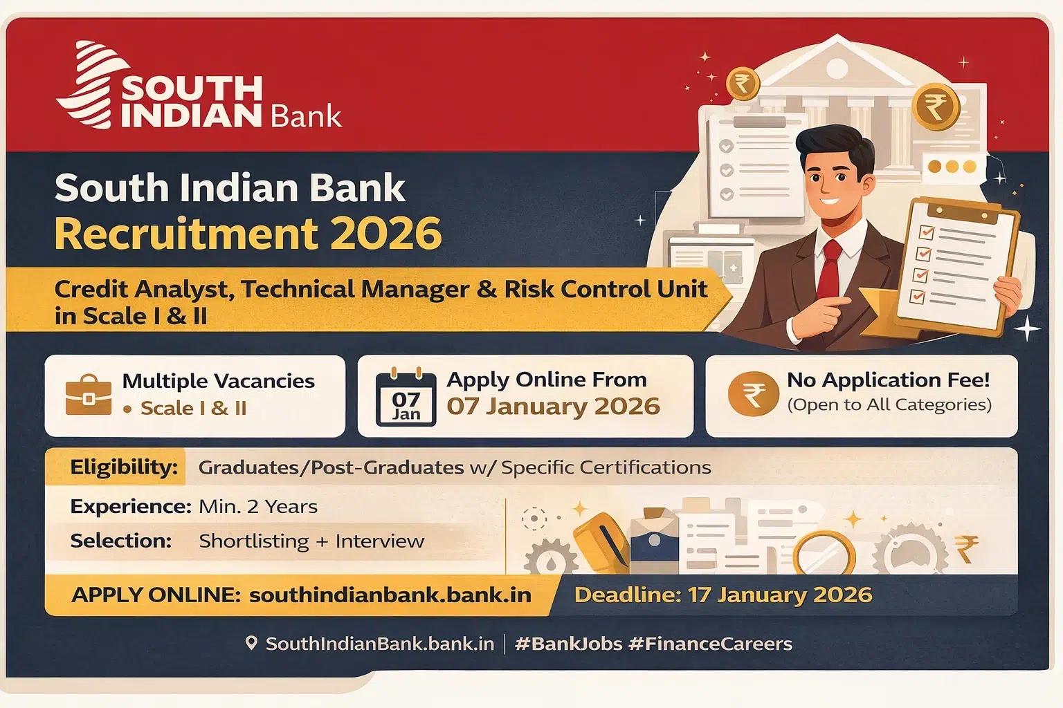 The South Indian Bank Recruitment 2026 notification has been officially released for the recruitment of Credit Analyst, Technical Manager/Regional Technical Manager, and Lead Analyst β Risk Control Unit in the Scale I/Scale II cadre. The online application process starts on 07 January 2026 and will remain open till 17 January 2026. Eligible Indian Nationals with relevant professional qualifications and experience can apply online through the official website of South Indian Bank. There is no application fee, and selection will be based on shortlisting and an interview.