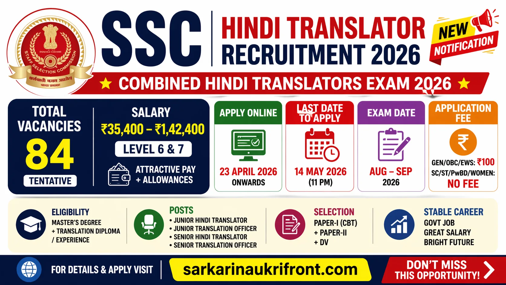 The Staff Selection Commission (SSC) has officially released the Combined Hindi Translators Examination 2026 notification for recruitment to prestigious Group ‘B’ Central Government posts such as Junior Hindi Translator (JHT), Junior Translation Officer (JTO), Senior Hindi Translator (SHT), Senior Translator, and Senior Translation Officer. Candidates with Hindi-English translation qualifications can now apply online for 84 tentative vacancies through SSC’s official website.
