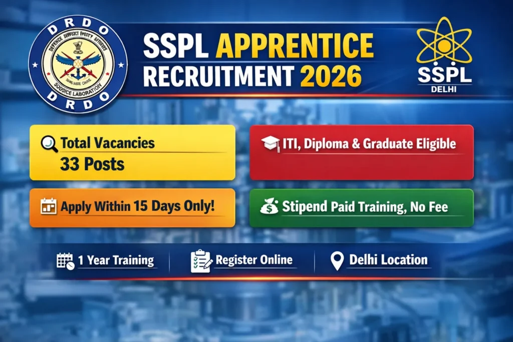 Solid State Physics Laboratory (SSPL), Delhi, under the Defence Research & Development Organisation (DRDO), Ministry of Defence, Government of India, has released a powerful SSPL apprenticeship notification for 2026. This recruitment drive invites ITI, Diploma, and Graduate candidates for 12 months of paid apprenticeship training under the Apprentices Act, 1961. Candidates who passed their qualifying examinations between 2021 and 2025 can apply online.