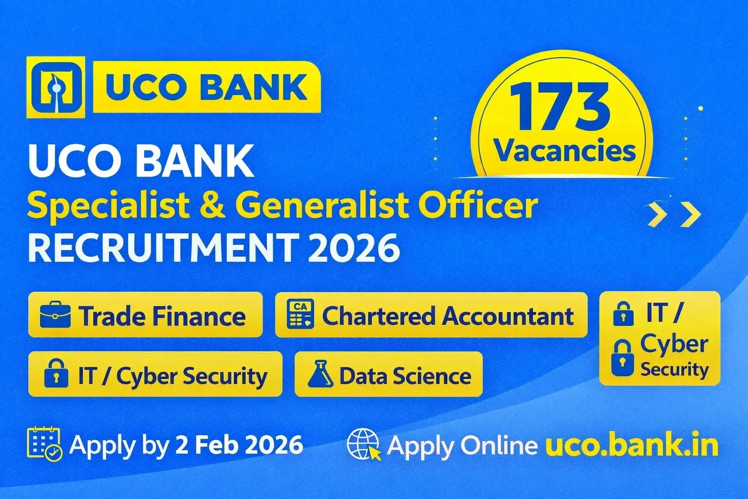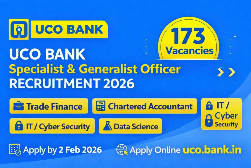 UCO Bank, a leading Government of India undertaking, has officially released the UCO Bank Officers Recruitment 2026 Notification for the engagement of Generalist and Specialist Officers regularly for the financial year 2026-27. This is one of the biggest PSU Bank recruitments of the year, with 173 vacancies across Trade Finance, Treasury, Chartered Accountancy, IT, Data Science, Cyber Security, Cloud Computing, AI/ML, and Core Banking Technologies.